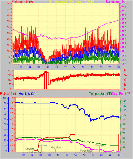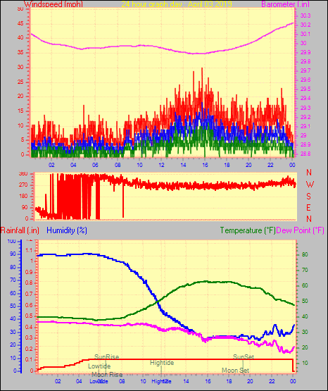Maximum gust speed = 29.9 mph from 260 °( W ) on day 03 at time 15:47