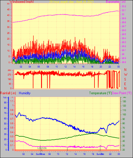 Maximum gust speed = 28.8 mph from 278 °( W ) on day 30 at time 22:57
