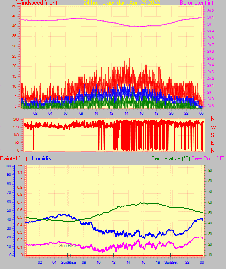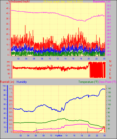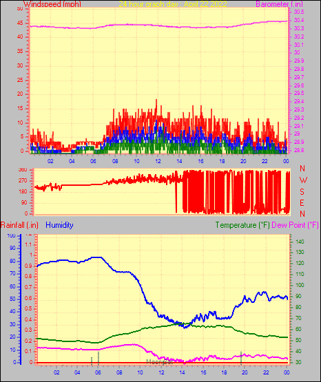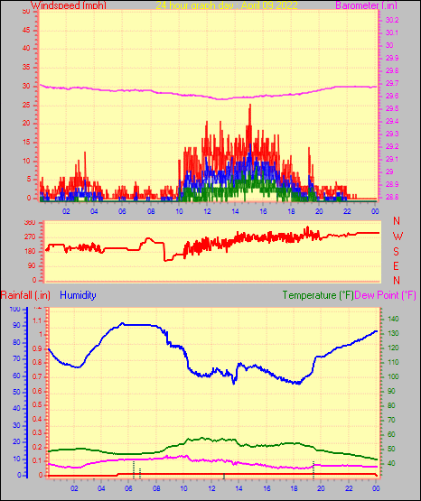 Maximum gust speed = 15.0 mph from 285 °(WNW) on day 03 at time 23:50