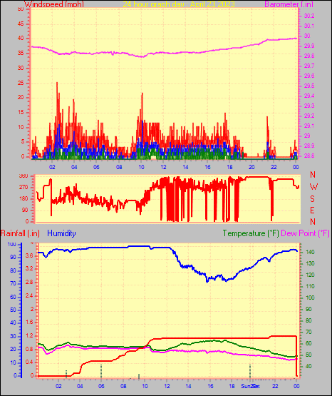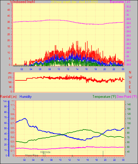 Maximum gust speed = 25.3 mph from 226 °( SW) on day 03 at time 16:28