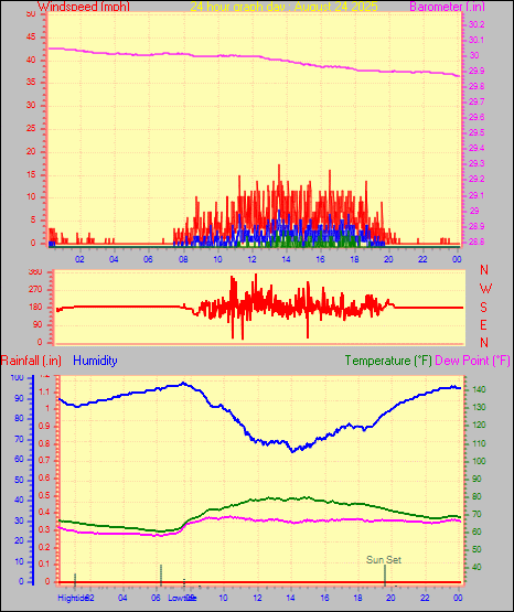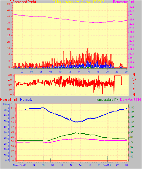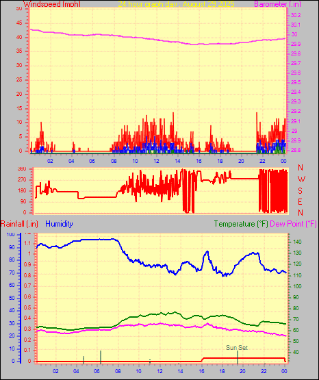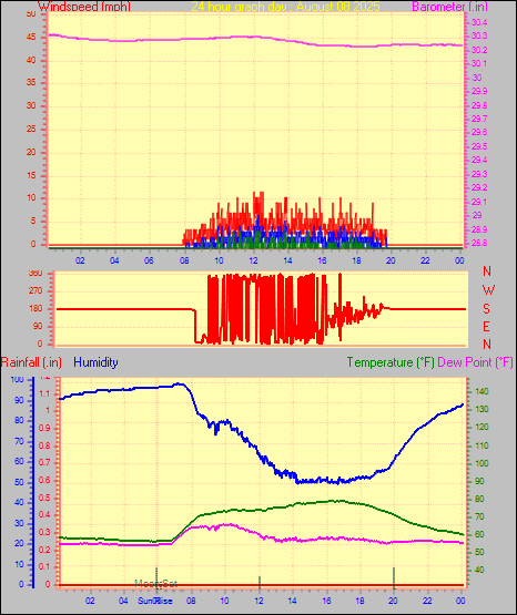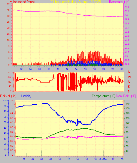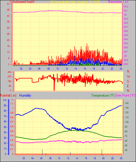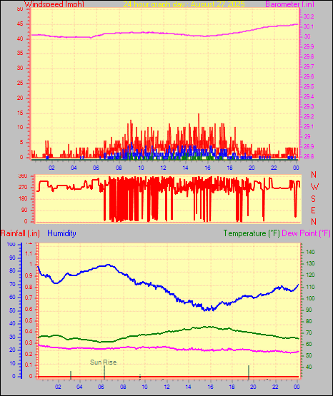 Maximum gust speed = 15.0 mph from 344 °(NNW) on day 30 at time 00:20