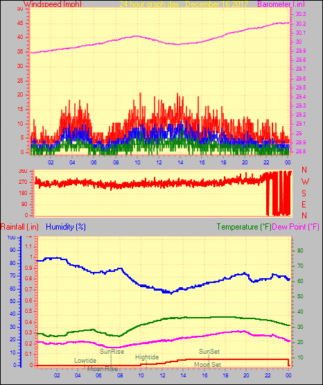 Maximum gust speed = 32.2 mph from 270°( W ) on day 13 at time 07:49