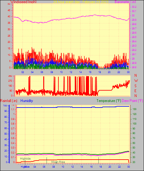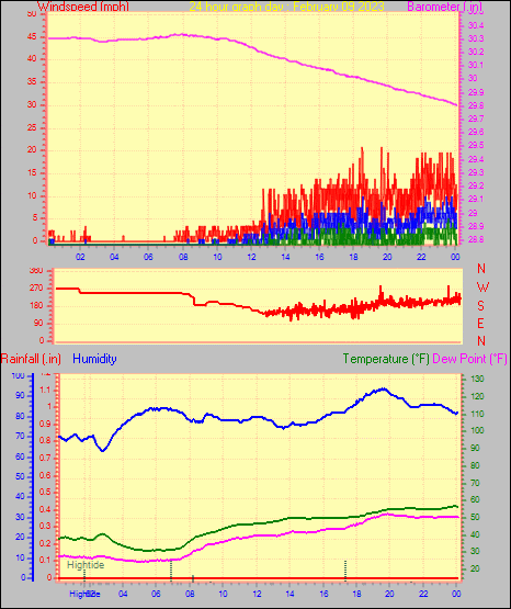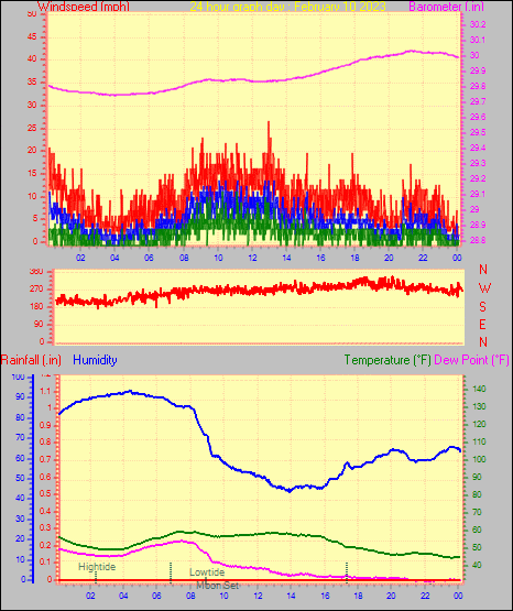 Maximum gust speed = 25.3 mph from 283 °(WNW) on day 04 at time 04:04