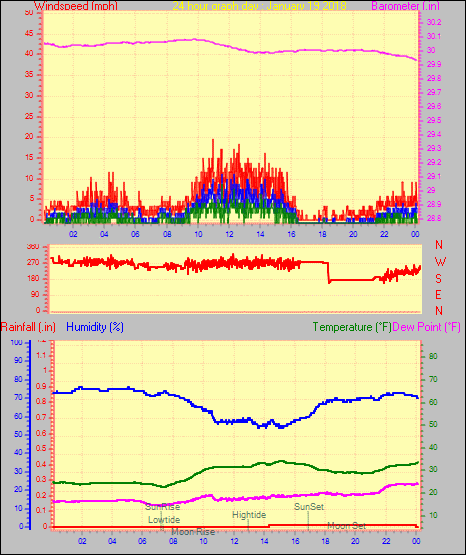 Maximum gust speed = 18.4 mph from 237 °(WSW) on day 28 at time 00:26