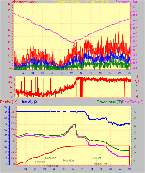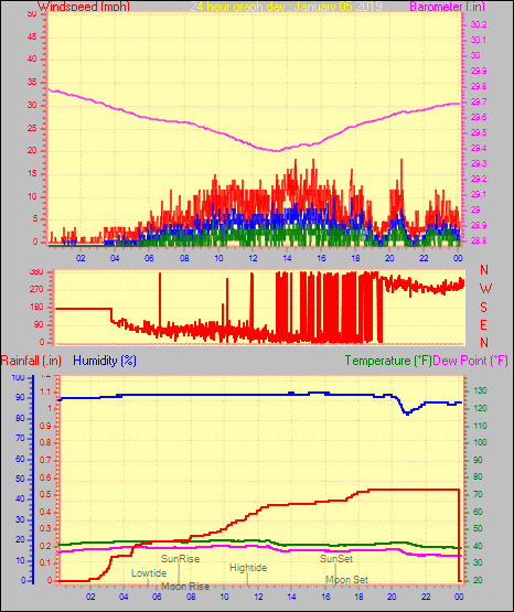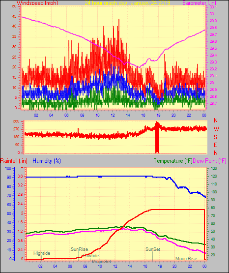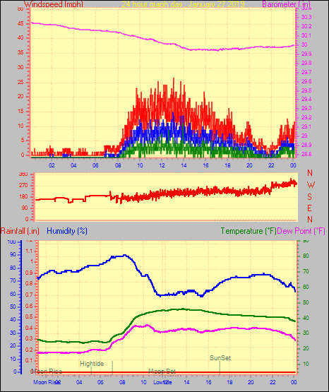 Maximum gust speed = 29.9 mph from 296 °(WNW) on day 01 at time 10:17