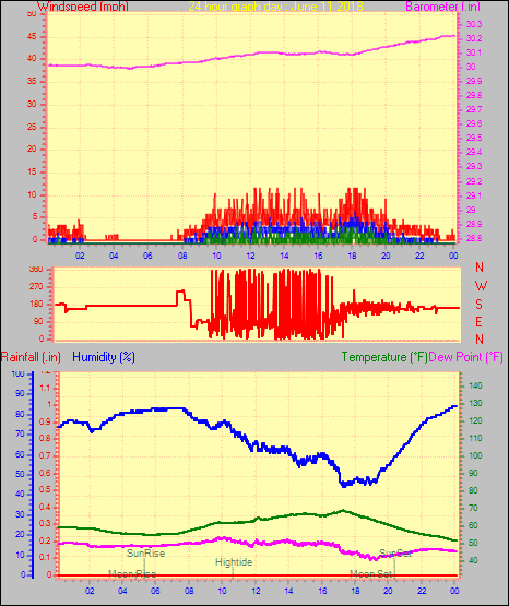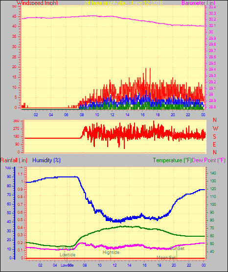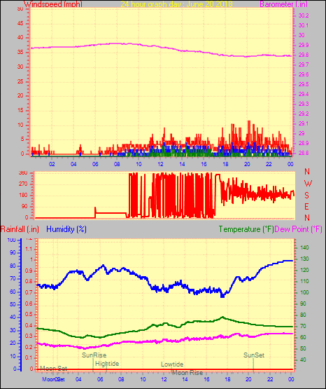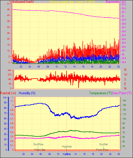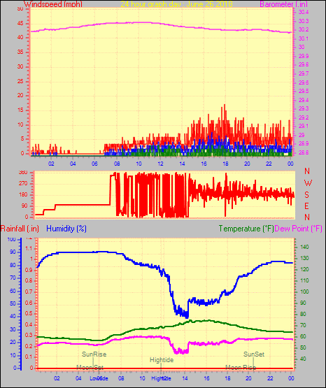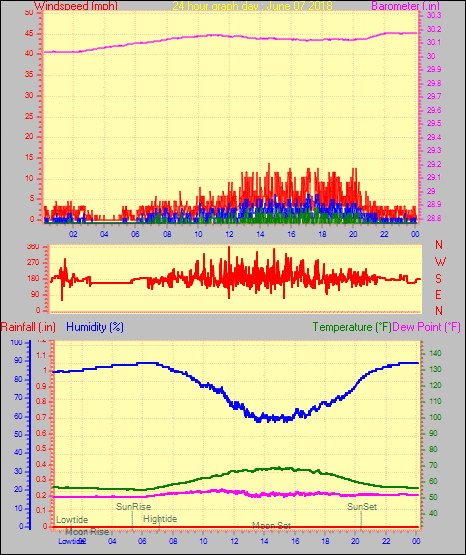 Maximum gust speed = 23.0 mph from 180°( S ) on day 28 at time 04:26