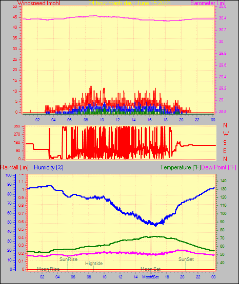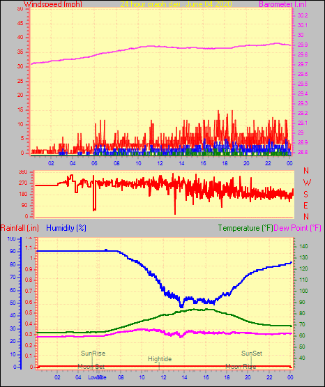 Maximum windspeed = 12.7 mph from 113°(ESE) on day 11 at time 07:20