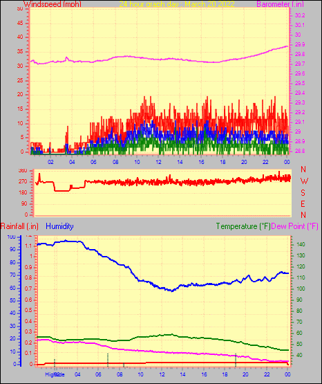 Maximum windspeed = 19.6 mph from 284°(WNW) on day 12 at time 23:50