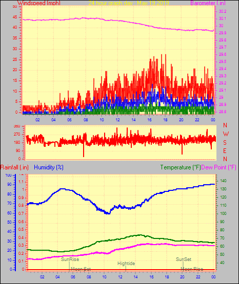 Maximum windspeed = 13.8 mph from 223°( SW) on day 19 at time 16:22