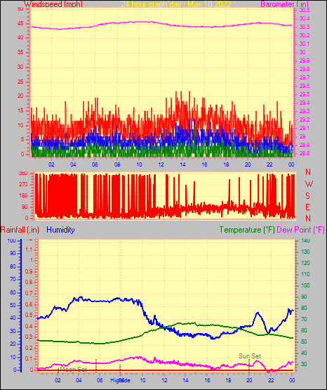 Maximum windspeed = 12.7 mph from 098°( E ) on day 10 at time 15:07