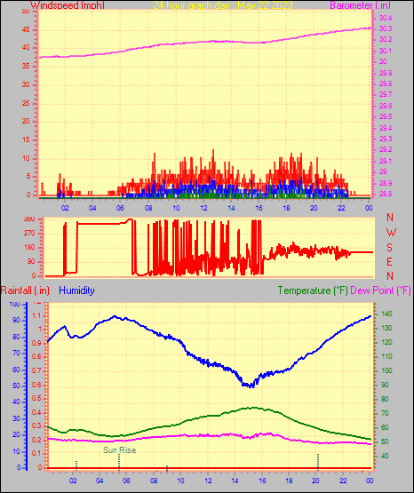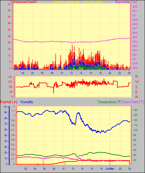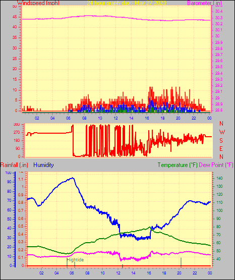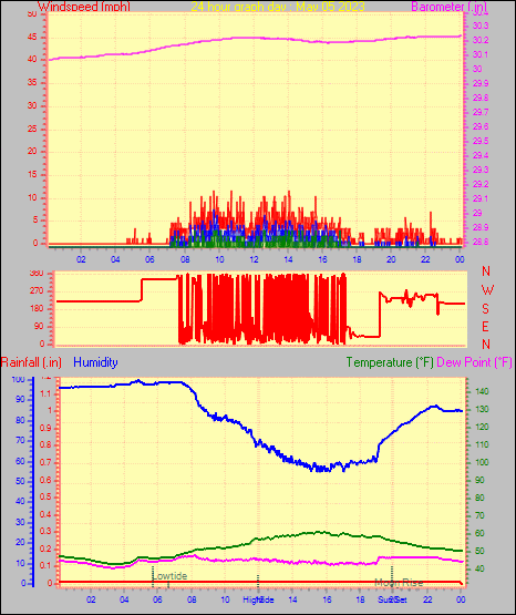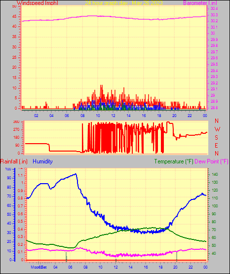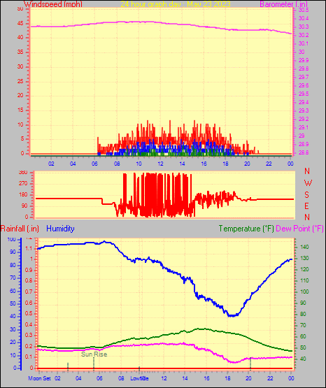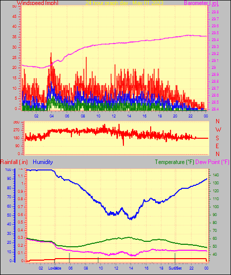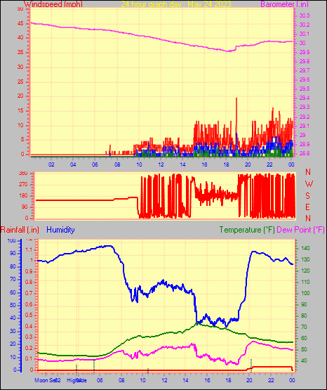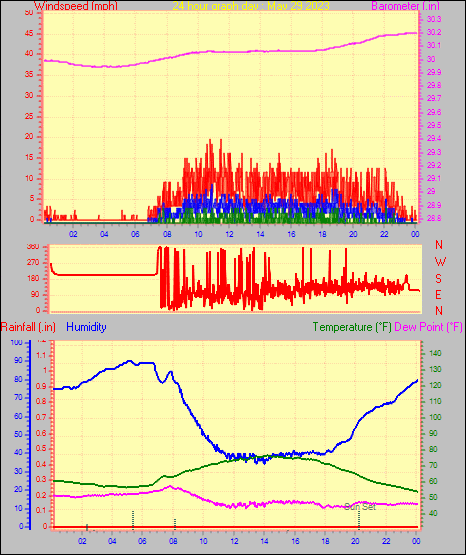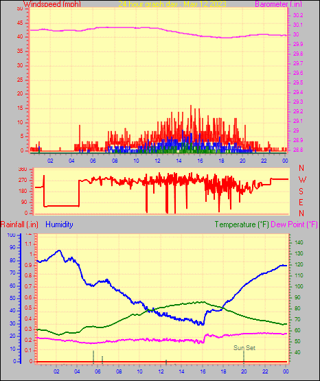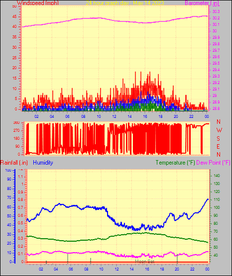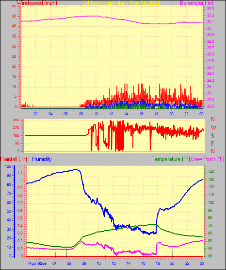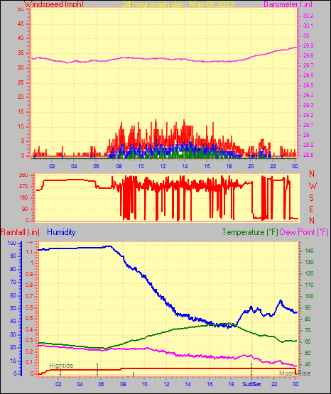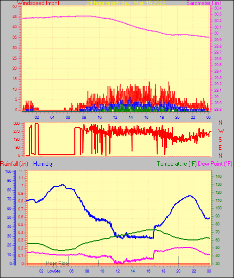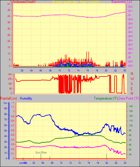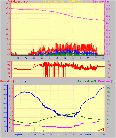 Maximum windspeed = 13.8 mph from 273°( W ) on day 01 at time 03:57