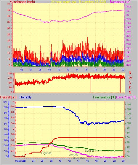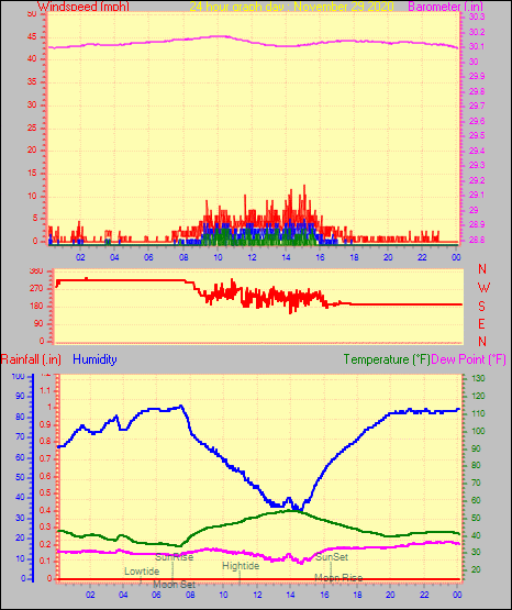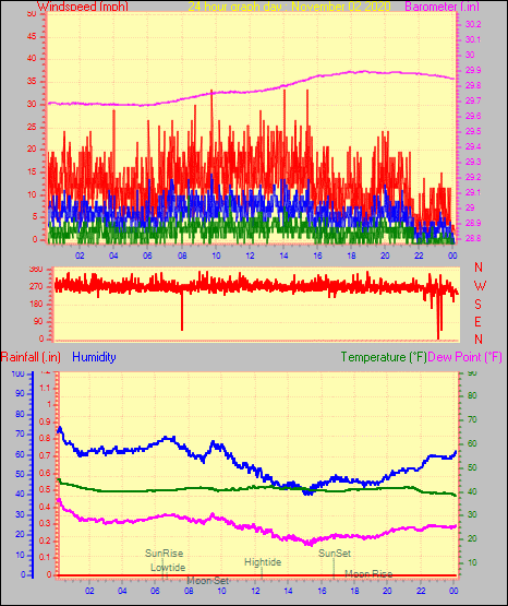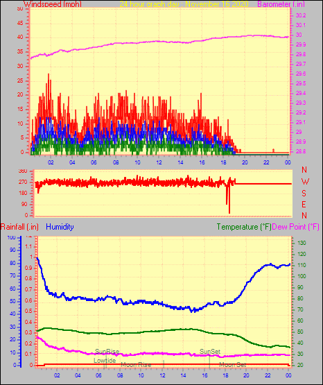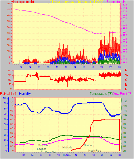 Maximum gust speed = 26.5 mph from 283 °(WNW) on day 01 at time 22:32