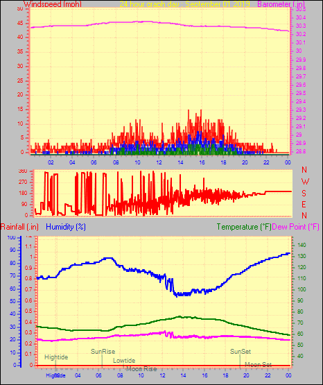 Maximum gust speed = 15.0 mph from 029 °(NNE) on day 29 at time 08:59