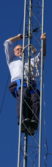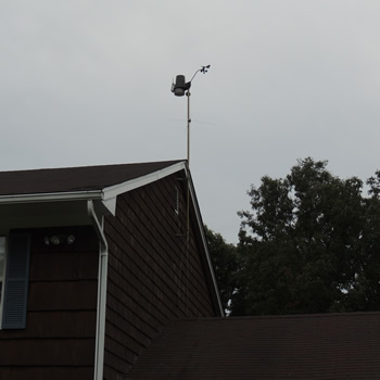 The main unit (the "integrated sensor suite") is mounted above the roof of my home (for our sister station, it's mounted on a large mast above the third floor of Schreiber High School). In addition to the anemometer and wind cups, the integrated sensor suite measures rainfall to the 100th of an inch, as well as sensors for temperature, humidity, solar radiation and ultraviolet index. All these readings are fed into the "brains" of the unit, a "sensor interface module" ("SIM") with radio transmitter. The sensor interface module is battery powered, with a solar panel keeping the battery charged.